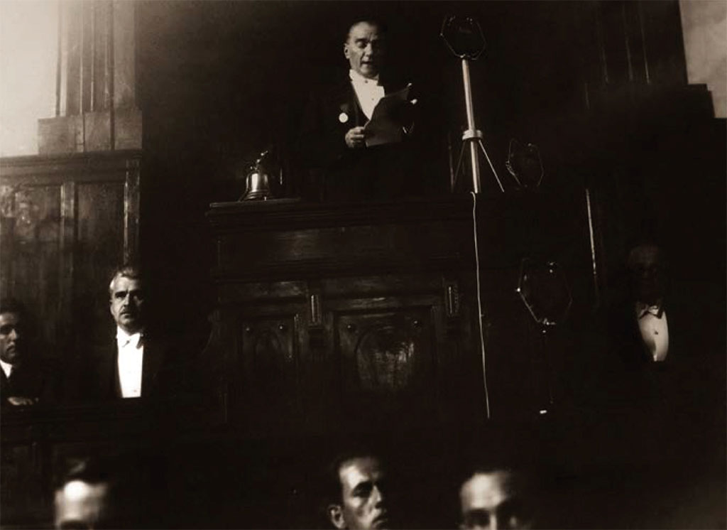 Mustafa Kemal cumhuriyetin 10. yıl dönümünde TBMM’de milletvekillerine konuşma yaparken, Ankara, 29 Ekim 1933.
